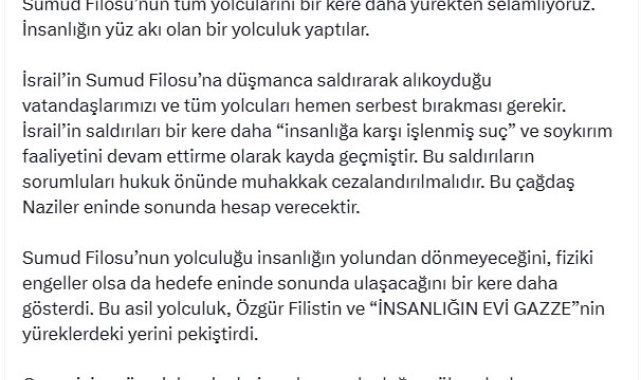 AK Parti Sözcüsü Ömer Çelik, "İsrail'in Sumud Filosu'na düşmanca saldırarak alıkoyduğu vatandaşlarımızı ve tüm yolcuları hemen serbest bırakması gerekir" dedi.AK Parti Sözcüsü Ömer Çelik, sosyal medya hesabından yaptığı açıklamada, "Sumud Filosu'nun tüm yolcularını bir kere daha yürekten selamlıyoruz. İnsanlığın yüz akı olan bir yolculuk yaptılar. İsrail'in Sumud Filosu'na düşmanca saldırarak alıkoyduğu vatandaşlarımızı ve tüm yolcuları hemen serbest bırakması gerekir. İsrail'in saldırıları bir kere daha insanlığa karşı işlenmiş suç ve soykırım faaliyetini devam ettirme olarak kayda geçmiştir. Bu saldırıların sorumluları hukuk önünde muhakkak cezalandırılmalıdır. Bu çağdaş Naziler eninde sonunda hesap verecektir. Sumud Filosu'nun yolculuğu insanlığın yolundan dönmeyeceğini, fiziki engeller olsa da hedefe eninde sonunda ulaşacağını bir kere daha gösterdi. Bu asil yolculuk, özgür Filistin ve insanlığın evi Gazze'nin yüreklerdeki yerini pekiştirdi. Gazze için mücadele edenlerin yolu ve yolculuğu mübarek olsun" ifadelerini kullandı.