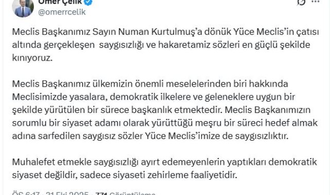 ANKARA, (DHA)- AK Parti Genel Başkan Yardımcısı ve Parti Sözcüsü Ömer Çelik, "Meclis Başkanımız Sayın Numan Kurtulmuş'a dönük yüce Meclis'in çatısı altında gerçekleşen saygısızlığı ve hakaretamiz sözleri en güçlü şekilde kınıyoruz" dedi