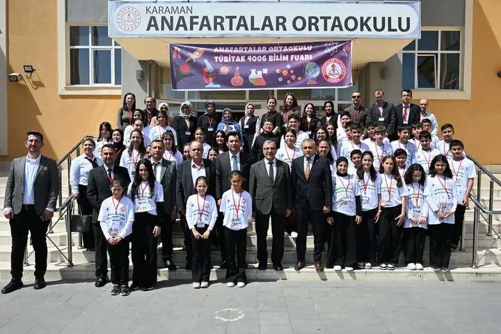 Karaman'da Anafartalar Ortaokulu ev sahipliğinde düzenlenen TÜBİTAK 4006-B Bilim Fuarı'nda, öğrencilerin yıl boyunca hazırladığı 20 proje sergilendi. Bilim ve öğrenme heyecanının ön plana çıktığı fuar, ziyaretçilerin beğenisine sunuldu.Fuarın açılışına Karamanoğlu Mehmetbey Üniversitesi Rektörü Prof. Dr. Mehmet Gavgalı, İl Millî Eğitim Müdür Yardımcısı İsmail Kılınç, İl Millî Eğitim Şube Müdürleri Şahin Yeter ve Hüseyin Sekman, Haşim Tunca, okul yöneticileri, öğretmenler ve öğrenciler katıldı. Kurdele kesiminin ardından protokol üyeleri, öğrencilerin fen bilimlerinden teknolojiye, çevre bilincinden günlük yaşamı kolaylaştıran tasarımlara kadar geniş bir yelpazede hazırladığı projeleri inceledi.