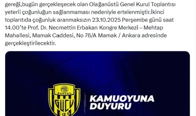 MKE Ankaragücü'nün olağanüstü genel kurul toplantısı, yeterli çoğunluk sağlanamadığı için ertelendi. Başkent ekibinin kongresi çoğunluk aranmaksızın 23 Ekim'de yapılacak.MKE Ankaragücü'nde bugün yapılması planlanan olağanüstü genel kurul toplantısı, yeterli çoğunluk sağlanamadığı gerekçesiyle ertelendi. Ertelemenin ardından başkent ekibinden yapılan yazılı açıklamada, "MKE Ankaragücü'nden olağanüstü genel kurul hakkında yapılan yazılı açıklamada, "Yönetim Kurulumuz tarafından 26.09.2025 tarih ve 221 sayılı karar gereği, bugün gerçekleşecek olan 'Olağanüstü Genel Kurul Toplantısı' yeterli çoğunluğun sağlanmaması nedeniyle ertelenmiştir. 2'nci toplantıda çoğunluk aranmaksızın 23.10.2025 Perşembe günü saat 14.00'te Prof. Dr. Necmettin Erbakan Kongre Merkezi - Mehtap Mahallesi, Mamak Caddesi, No 76/A Mamak/Ankara adresinde gerçekleştirilecektir" ifadeleri kullanıldı.