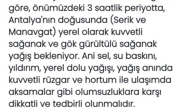 Meteoroloji Genel Müdürlüğü, Antalya'nın doğu bölgeleri için kuvvetli yağış uyarısında bulundu. Yapılan son değerlendirmelere göre, önümüzdeki 3 saatlik periyotta Serik ve Manavgat ilçelerinde yerel olarak kuvvetli sağanak ve gök gürültülü sağanak yağışların etkili olması bekleniyor.