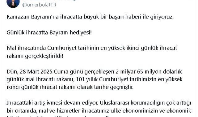 Ticaret Bakanı Ömer Bolat, sosyal medya hesabından yaptığı açıklamada, "Ramazan Bayramı'na ihracatta büyük bir başarı haberi ile giriyoruz. Günlük ihracatta bayram hediyesi. Mal ihracatında Cumhuriyet tarihinin en yüksek ikinci günlük ihracat rakamı gerçekleştirildi. Dün, 28 Mart 2025 Cuma günü gerçekleşen 2 milyar 65 milyon dolarlık günlük mal ihracatı rakamı, 101 yıllık Cumhuriyet tarihimizin en yüksek ikinci günlük ihracat rakamı olarak tarihe geçmiştir" ifadelerini kullandı.