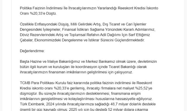 TİCARET Bakanı Ömer Bolat, "Enflasyondaki düşüş, milli gelirdeki artış, dış ticaret ve cari işlemler dengesindeki iyileşmeler, finansal istikrarı sağlama yönündeki kararlı adımlarımız, döviz rezervlerindeki artış ve toplumsal refahın adil dağılımı için sarf ettiğimiz çabalar, ekonomimizdeki dengelenme ve istikrar sürecini güçlendirmektedir" dedi.Ticaret Bakanı Ömer Bolat, NSosyal hesabından yaptığı açıklamada, Türkiye Cumhuriyet Merkez Bankası'nın (TCMB) politika faiz oranını 250 baz puan düşürerek yüzde 40,5'e çekmesine ilişkin değerlendirmede bulundu. Bolat, "Başta Hazine ve Maliye Bakanlığımız ve Merkez Bankamız olmak üzere, devletimizin bütün ilgili kurum ve kuruluşları ile koordinasyon içinde Ticaret Bakanlığı olarak ihracatçılarımızın finansman imkanlarının geliştirilmesi için çalışıyoruz. TCMB Para Politikası Kurulu faiz kararında politika faizinin indirilmesi ile Reeskont Kredisi iskonto oranı yüzde 20,33'e gerilemiş, ihracatçı firmalara net maliyet yüzde 25,52'ye düşmüştür. Bu süreçte ihracatçılarımızın desteklenmesi, finansmana erişim imkanlarının genişletilmesi ve kolaylaştırılması hususlarına hassasiyetle eğiliyoruz" dedi.Türk Eximbank'ın, 2024 yılında ihracatçılara sağladığı 48,7 milyar dolarlık destekle önemli bir güç kaynağı olduğunu vurgulayan Bolat, "2025 yılı için bu desteği 52 milyar dolara çıkarma hedefiyle, ihracatçılarımızı küresel ticarette daha rekabetçi kılmak adına kararlılıkla yoluna devam etmektedir. Özellikle enflasyondaki düşüş, milli gelirdeki artış, dış ticaret ve cari işlemler dengesindeki iyileşmeler, finansal istikrarı sağlama yönündeki kararlı adımlarımız, döviz rezervlerindeki artış ve toplumsal refahın adil dağılımı için sarf ettiğimiz çabalar, ekonomimizdeki dengelenme ve istikrar sürecini güçlendirmektedir" ifadelerini kullandı.