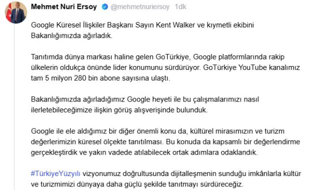 KÜLTÜR ve Turizm Bakanı Mehmet Nuri Ersoy, "GoTürkiye YouTube kanalımız tam 5 milyon 280 bin abone sayısına ulaştı" dedi.Bakan Ersoy, NSosyal hesabından yaptığı paylaşımda, Google Küresel İlişkiler Başkanı Kent Walker ve ekibini Bakanlıkta ağırladıklarını duyurdu. Ersoy, "Tanıtımda dünya markası haline gelen GoTürkiye, Google platformlarında rakip ülkelerin oldukça önünde lider konumunu sürdürüyor. GoTürkiye YouTube kanalımız tam 5 milyon 280 bin abone sayısına ulaştı. Bakanlığımızda ağırladığımız Google heyeti ile bu çalışmalarımızı nasıl ilerletebileceğimize ilişkin görüş alışverişinde bulunduk. Google ile ele aldığımız bir diğer önemli konu da kültürel mirasımızın ve turizm değerlerimizin küresel ölçekte tanıtılması. Bu konuda da kapsamlı bir değerlendirme gerçekleştirdik ve yakın vadede atılabilecek ortak adımlara odaklandık. Türkiye Yüzyılı vizyonumuz doğrultusunda dijitalleşmenin sunduğu imkanlarla kültür ve turizmimizi dünyaya daha güçlü şekilde tanıtmayı sürdüreceğiz" açıklamasında bulundu.