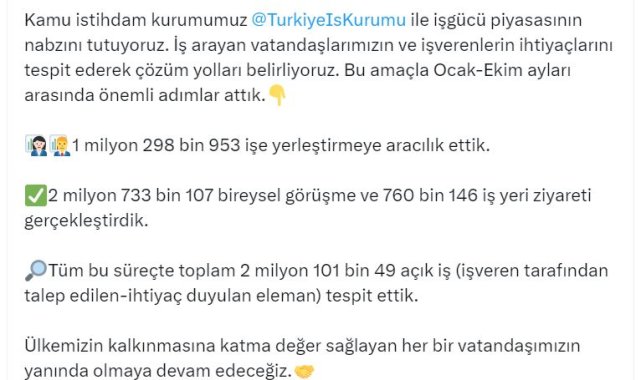 ÇALIŞMA ve Sosyal Güvenlik Bakanı Vedat Işıkhan, Türkiye İş Kurumu (İŞKUR) ile ocak-ekim ayları arasında 1 milyon 298 bin 953 işe yerleştirmeye aracılık ettiklerini duyurdu.Bakan Işıkhan, sosyal medya hesabından yaptığı açıklamada, "Kamu istihdam kurumumuz İŞKUR ile iş gücü piyasasının nabzını tutuyoruz. İş arayan vatandaşlarımızın ve işverenlerin ihtiyaçlarını tespit ederek çözüm yolları belirliyoruz. Bu amaçla ocak-ekim ayları arasında önemli adımlar attık. 1 milyon 298 bin 953 işe yerleştirmeye aracılık ettik. 2 milyon 733 bin 107 bireysel görüşme ve 760 bin 146 iş yeri ziyareti gerçekleştirdik. Tüm bu süreçte toplam 2 milyon 101 bin 49 açık iş (işveren tarafından talep edilen-ihtiyaç duyulan eleman) tespit ettik. Ülkemizin kalkınmasına katma değer sağlayan her bir vatandaşımızın yanında olmaya devam edeceğiz" dedi.