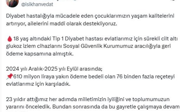 Çalışma ve Sosyal Güvenlik Bakanı Vedat Işıkhan, sosyal medya hesabından yaptığı açıklamada, "Diyabet hastalığıyla mücadele eden çocuklarımızın yaşam kalitelerini artırıyor, ailelerini maddi olarak destekliyoruz. 18 yaş altındaki Tip 1 Diyabet hastası evlatlarımız için sürekli cilt altı glukoz izlem cihazlarını Sosyal Güvenlik Kurumumuz aracılığıyla geri ödeme kapsamına almıştık. 2024 yılı Aralık-2025 yılı Eylül arasında 610 milyon liraya yakın ödeme bedeli olan 76 binden fazla reçeteyi evlatlarımız için karşıladık. 23 yıldır attığımız her adımda milletimizin iyiliğini ve toplumumuzun yararını önceledik. Bundan sonrasında da bu gayretle çalışmaya devam edeceğiz" ifadelerini kullandı.