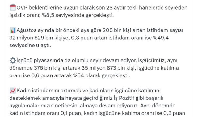ÇALIŞMA ve Sosyal Güvenlik Bakanı Vedat Işıkhan, ağustos ayında kadın istihdam oranının 0,1 puan, kadın iş gücüne katılma oranının ise 0,3 puan artış gösterdiğini belirtti.Bakan Vedat Işıkhan, Türkiye İstatistik Kurumu'nun açıkladığı Ağustos 2025 dönemine ilişkin iş gücü istatistikleriyle ilgili değerlendirmede bulundu. Işıkhan, sosyal medya hesabından yaptığı açıklamada, "Ülkemizin geleceğini şekillendirecek istihdam hamlelerimizi ekonomi yönetimimiz ile tam bir koordinasyon içerisinde gerçekleştiriyoruz. OVP beklentilerine uygun olarak son 28 aydır tekli hanelerde seyreden işsizlik oranı; yüzde 8,5 seviyesinde gerçekleşti. Ağustos ayında bir önceki aya göre 208 bin kişi artan istihdam sayısı 32 milyon 829 bin kişiye, 0,3 puan artan istihdam oranı ise yüzde 49,4 seviyesine ulaştı" dedi.'İŞ GÜCÜ PİYASASINDA OLUMLU SEYİR DEVAM EDİYOR'Bakan Işıkhan, "İş gücü piyasasında da olumlu seyir devam ediyor. İş gücümüz, aynı dönemde 376 bin kişi artarak 35 milyon 873 bin kişi, iş gücüne katılma oranı ise 0,6 puan artarak yüzde 54 olarak gerçekleşti. Kadın istihdamını artırmak ve kadınların iş gücüne katılımını desteklemek amacıyla hayata geçirdiğimiz İş Pozitif gibi başarılı uygulamalarımızın neticesini almaya devam ediyoruz. Aynı dönemde kadın istihdam oranı 0,1 puan, kadın iş gücüne katılma oranı ise 0,3 puan artış gösterdi. Ekonomi modelimizin parolası olan; yatırım, istihdam, üretim ve ihracat odaklı politikalarımızı tüm kesimlerin desteğiyle uygulamaya devam edeceğiz" ifadelerini kullandı.