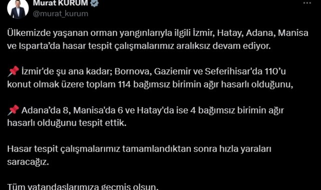 ÇEVRE, Şehircilik ve İklim Değişikliği Bakanı Murat Kurum, 5 ildeki orman yangınlarında 132 bağımsız birimin ağır hasar gördüğünü açıkladı.Çevre, Şehircilik ve İklim Değişikliği Bakanı Murat Kurum, sosyal medya hesabından yaptığı açıklamada, "Ülkemizde yaşanan orman yangınlarıyla ilgili İzmir, Hatay, Adana, Manisa ve Isparta'da hasar tespit çalışmalarımız devam ediyor. İzmir'de şu ana kadar; Bornova, Gaziemir ve Seferihisar'da 110'u konut olmak üzere toplam 114 bağımsız birimin ağır hasarlı olduğunu, Adana'da 8, Manisa'da 6 ve Hatay'da ise 4 bağımsız birimin ağır hasarlı olduğunu tespit ettik. Hasar tespit çalışmalarımız tamamlandıktan sonra hızla yaraları saracağız. Tüm vatandaşlarımıza geçmiş olsun" ifadelerini kullandı.