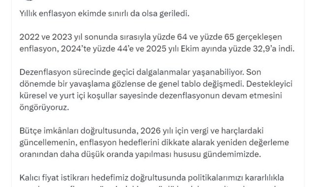 Bakan Şimşek, Türkiye İstatistik Kurumu'nun (TÜİK) açıkladığı Ekim 2025 dönemine ilişkin enflasyon verileriyle ilgili değerlendirmede bulundu. Şimşek, sosyal medya hesabından yaptığı açıklamada, "Yıllık enflasyon ekimde sınırlı da olsa geriledi. 2022 ve 2023 yıl sonunda sırasıyla yüzde 64 ve yüzde 65 gerçekleşen enflasyon, 2024'te yüzde 44'e ve 2025 yılı ekim ayında yüzde 32,9'a indi. Dezenflasyon sürecinde geçici dalgalanmalar yaşanabiliyor. Son dönemde bir yavaşlama gözlense de genel tablo değişmedi. Destekleyici küresel ve yurt içi koşullar sayesinde dezenflasyonun devam etmesini öngörüyoruz. Bütçe imkanları doğrultusunda, 2026 yılı için vergi ve harçlardaki güncellemenin, enflasyon hedeflerini dikkate alarak yeniden değerleme oranından daha düşük oranda yapılması hususu gündemimizde. Kalıcı fiyat istikrarı hedefimiz doğrultusunda politikalarımızı kararlılıkla uyguluyor, enflasyon üzerindeki arz yönlü baskıları azaltacak yapısal adımları atıyoruz" dedi.