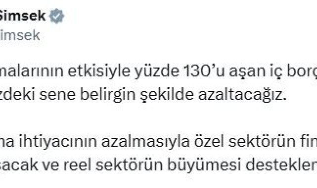 HAZİNE ve Maliye Bakanı Mehmet Şimşek, "Deprem harcamalarının etkisiyle yüzde 130'u aşan iç borç çevirme oranını önümüzdeki sene belirgin şekilde azaltacağız" dedi.Hazine ve Maliye Bakanı Mehmet Şimşek, kamu borçları ve özel sektöre yönelik desteklere ilişkin sosyal medya hesabından açıklama yaptı. Bakan Şimşek, "Deprem harcamalarının etkisiyle yüzde 130'u aşan iç borç çevirme oranını önümüzdeki sene belirgin şekilde azaltacağız. Kamu borçlanma ihtiyacının azalmasıyla özel sektörün finansmana erişimi kolaylaşacak ve reel sektörün büyümesi desteklenecektir" ifadelerini kullandı.