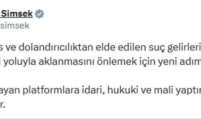 HAZİNE ve Maliye Bakanı Mehmet Şimşek, yasa dışı bahis ve dolandırıcılıktan elde edilen suç gelirlerinin kripto varlık işlemleri yoluyla aklanmasını önlemek için yeni adımlar attıklarını açıkladı.Hazine ve Maliye Bakanı Mehmet Şimşek, sosyal medya hesabından yaptığı açıklamada, "Yasa dışı bahis ve dolandırıcılıktan elde edilen suç gelirlerinin kripto varlık işlemleri yoluyla aklanmasını önlemek için yeni adımlar atıyoruz. Uyum sağlamayan platformlara idari, hukuki ve mali yaptırımlar uygulanacaktır" ifadelerini kullandı.