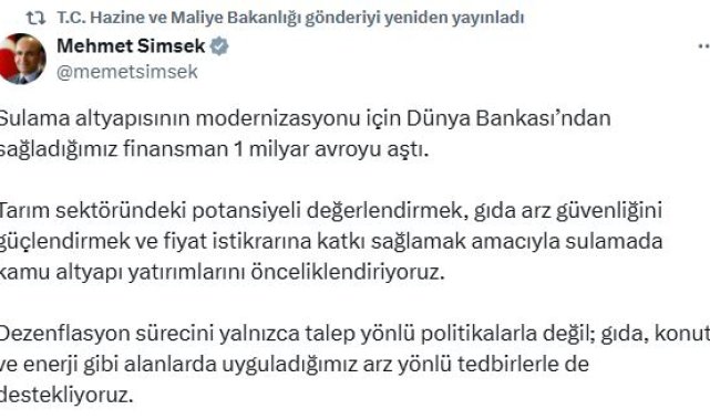 Hazine ve Maliye Bakanı Mehmet Şimşek, sosyal medya hesabından yaptığı açıklamada, "Sulama altyapısının modernizasyonu için Dünya Bankası'ndan sağladığımız finansman 1 milyar avroyu aştı. Tarım sektöründeki potansiyeli değerlendirmek, gıda arz güvenliğini güçlendirmek ve fiyat istikrarına katkı sağlamak amacıyla sulamada kamu altyapı yatırımlarını önceliklendiriyoruz. Dezenflasyon sürecini yalnızca talep yönlü politikalarla değil; gıda, konut ve enerji gibi alanlarda uyguladığımız arz yönlü tedbirlerle de destekliyoruz" ifadelerini kullandı.
