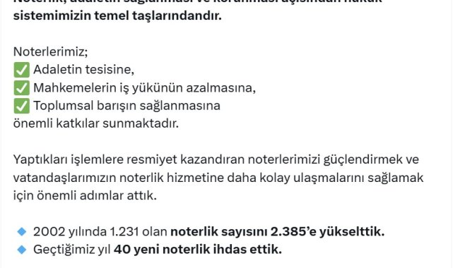 ADALET Bakanı Yılmaz Tunç, "Noterlik hizmetlerinin daha etkin ve verimli yürütülmesi amacıyla 6 Nisan 2019 tarihinde başlattığımız nöbetçi noterlik uygulamasıyla vatandaşlarımızın hafta sonları da noterlik hizmetine ulaşabilmesini sağladık ve bu kapsamda bugüne kadar 3 milyon 960 bin 246 işlem gerçekleştirildi" dedi.Bakan Tunç, sosyal medya hesabından yaptığı açıklamada, "Noterlik, adaletin sağlanması ve korunması açısından hukuk sistemimizin temel taşlarındandır. Noterlerimiz; adaletin tesisine, mahkemelerin iş yükünün azalmasına ve toplumsal barışın sağlanmasına önemli katkılar sunmaktadır. Yaptıkları işlemlere resmiyet kazandıran noterlerimizi güçlendirmek ve vatandaşlarımızın noterlik hizmetine daha kolay ulaşmalarını sağlamak için önemli adımlar attık. 2002 yılında 1231 olan noterlik sayısını 2 bin 385'e yükselttik. Geçen yıl 40 yeni noterlik ihdas ettik. Noterlik hizmetlerinin daha etkin ve verimli yürütülmesi amacıyla 6 Nisan 2019 tarihinde başlattığımız nöbetçi noterlik uygulamasıyla vatandaşlarımızın hafta sonları da noterlik hizmetine ulaşabilmesini sağladık ve bu kapsamda bugüne kadar 3 milyon 960 bin 246 işlem gerçekleştirildi" ifadelerini kullandı.'NOTERLİK HİZMETLERİNDE ZAMAN VE MEKAN SINIRINI ORTADAN KALDIRDIK'9'uncu Yargı Paketi ile 2024 yılında Noterlik Kanunu'nda yaptıkları değişiklikle noterlerin hafta sonu ve tatil günlerinde çalışma usul ve esaslarını yasal zemine kavuşturduklarını söyleyen Bakan Tunç, "Bu kapsamda 6 Kasım 2025 tarihli Resmi Gazete'de yayımlanan 'Noterlerin Tatil Gün ve Saatlerinde Çalışmasına İlişkin Yönetmelik' ile hafta sonu nöbet sisteminin ayrıntılı biçimde düzenlenmesini; nöbet günleri, çalışma saatleri ve noter sayılarının netleştirilmesini sağladık. Yeni uygulamalarla noterlik hizmetlerinde zaman ve mekan sınırını ortadan kaldırdık. Yurt dışında yapılan noterlik işlemi örneğinin ülkemizde herhangi bir noterlikten alınabilmesine imkan sağladık. Yurt içinde gerçekleştirilen işlem örneklerinin başka şehirlerdeki noterliklerden temin edilebilmesini mümkün kıldık. Noter ücretleri ile harç ve vergilerin kredi kartlarıyla ödenmesi uygulamasını hayata geçirdik. Güvenli ödeme sistemi, parmak iziyle kimlik doğrulama sistemi ve e-Randevu sistemi gibi birçok yeniliğe imza attık. Türkiye Yüzyılı Yargı Reformu Strateji Belgemizde yer alan hedeflerimiz doğrultusunda çalışmalarımızı sürdürecek, noterlik müessesesini güçlendirmeye ve geliştirmeye devam edeceğiz" dedi.