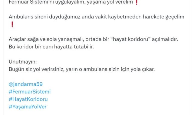 İÇİŞLERİ Bakanı Ali Yerlikaya, "Fermuar sistemini uygulayalım, yaşama yol verelim. Ambulans sireni duyduğumuz anda vakit kaybetmeden harekete geçelim" dedi.Bakan Yerlikaya, sosyal medya hesabından yaptığı açıklamada, "Fermuar sistemini uygulayalım, yaşama yol verelim Ambulans sireni duyduğumuz anda vakit kaybetmeden harekete geçelim. Araçlar sağa ve sola yanaşmalı, ortada bir 'hayat koridoru' açılmalıdır. Bu koridor bir canı hayatta tutabilir. Unutmayın; bugün siz yol verirsiniz, yarın o ambulans sizin için yola çıkar" ifadelerini kullandı.Bakan Yerlikaya paylaşımında ayrıca jandarma araçlarıyla fermuar sisteminin uygulandığı görüntülere yer verdi.