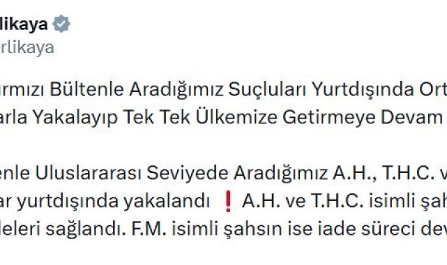 Bakan Ali Yerlikaya, sosyal medya hesabından yaptığı açıklamada, Interpol-Europol Daire Başkanlığı, Narkotik Suçlarla Mücadele, İstihbarat ve Göç İdaresi başkanlıkları koordinesinde, kırmızı bültenle aranan suçluların yurt dışında ortak operasyonlarla yakalanıp tek tek Türkiye'ye getirilmeye devam edildiğini belirtti. Kırmızı bültenle uluslararası seviyede aranan A.H., T.H.C. ve F.M.'nin yurt dışında yakalandığını belirten Bakan Yerlikaya, A.H. ve T.H.C. isimli şüphelilerin Türkiye'ye iadelerinin sağlandığını, F.M.'nin ise iade süreci devam ettiğini ifade etti.