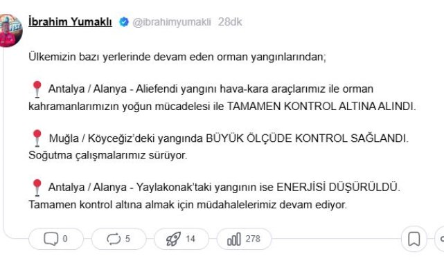 Bakan Yumaklı, NSosyal hesabından yaptığı açıklamada, "Ülkemizin bazı yerlerinde devam eden orman yangınlarından; Antalya Alanya- Aliefendi yangını hava kara araçlarımız ile orman kahramanlarımızın yoğun mücadelesi ile tamamen kontrol altına alındı. Muğla Köyceğiz'deki yangında büyük ölçüde kontrol sağlandı. Soğutma çalışmalarımız sürüyor. Antalya Alanya- Yaylakonak'taki yangının ise enerjisi düşürüldü. Tamamen kontrol altına almak için müdahalelerimiz devam ediyor" ifadelerini kullandı.