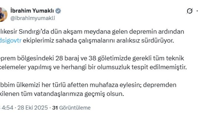 TARIM ve Orman Bakanı İbrahim Yumaklı, Balıkesir'in Sındırgı ilçesindeki depreme ilişkin, "Deprem bölgesindeki 28 baraj ve 38 göletimizde gerekli tüm teknik incelemeler yapılmış ve herhangi bir olumsuzluk tespit edilmemiştir" dedi. Bakan Yumaklı, sosyal medya hesabından yaptığı açıklamada, "Balıkesir Sındırgı'da dün akşam meydana gelen depremin ardından Devlet Su İşleri (DSİ) Genel Müdürlüğü'ne bağlı ekiplerimiz sahada çalışmalarını aralıksız sürdürüyor. Deprem bölgesindeki 28 baraj ve 38 göletimizde gerekli tüm teknik incelemeler yapılmış ve herhangi bir olumsuzluk tespit edilmemiştir. Rabb'im ülkemizi her türlü afetten muhafaza eylesin; depremden etkilenen tüm vatandaşlarımıza geçmiş olsun" ifadelerini kullandı.