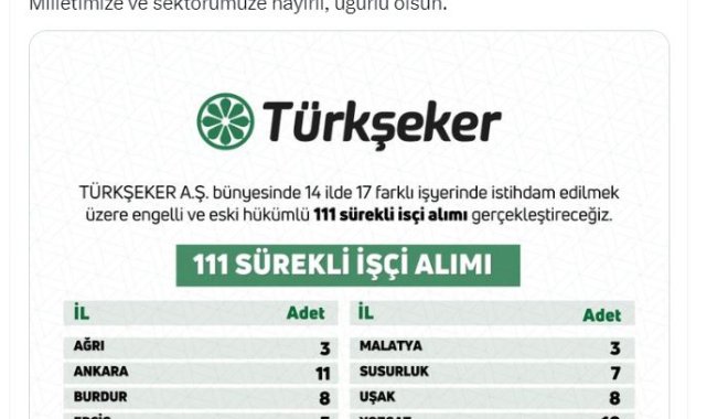 TARIM ve Orman Bakanı İbrahim Yumaklı, Türkşeker A.Ş'nin 14 ilde istihdam edilmek üzere engelli ve eski hükümlü 111 işçi alacağını duyurdu.Bakan Yumaklı, sosyal medya hesabından yaptığı açıklamada, "Türkşeker ailesi büyümeye devam ediyor. 14 ilde 17 iş yerinde çalışacak 111 yeni yol arkadaşımızı aramıza katıyor, istihdam ve üretime güç oluyoruz. Milletimize ve sektörümüze hayırlı, uğurlu olsun" dedi.Engelli ve eski hükümlü 111 işçi; Ağrı, Ankara, Afyonkarahisar, Burdur, Eskişehir, Kars, Kastamonu, Konya Ereğli ve Ilgın, Malatya, Balıkesir Susurluk, Uşak, Van Erciş, Yozgat ve Tokat Turhal'da istihdam edilecek. Başvurular, 26-30 Mayıs tarihleri arasında Türkiye İş Kurumu (İŞKUR) üzerinden gerçekleştirilecek.