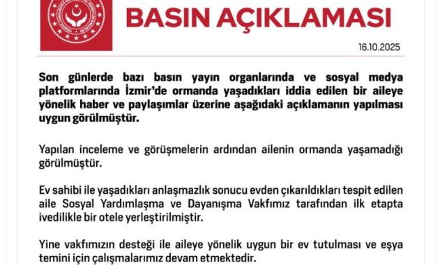 Bakanlığın sosyal medya hesabından yapılan açıklamada, "Son günlerde bazı basın yayın organlarında ve sosyal medya platformlarında İzmir'de ormanda yaşadıkları iddia edilen bir aileye yönelik haber ve paylaşımlar üzerine aşağıdaki açıklamanın yapılması uygun görülmüştür. Yapılan inceleme ve görüşmelerin ardından ailenin ormanda yaşamadığı görülmüştür. Ev sahibi ile yaşadıkları anlaşmazlık sonucu evden çıkarıldıkları tespit edilen aile, Sosyal Yardımlaşma ve Dayanışma Vakfımız tarafından ilk etapta ivedilikle bir otele yerleştirilmiştir. Yine vakfımızın desteği ile aileye yönelik uygun bir ev tutulması ve eşya temini için çalışmalarımız devam etmektedir" denildi.