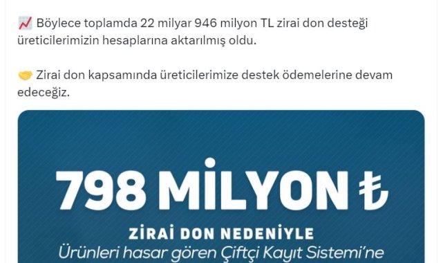 ANKARA, (DHA)- TARIM ve Orman Bakanı İbrahim Yumaklı, zirai don nedeniyle ürünleri hasar gören üreticilere 798 milyon TL destek ödemesi yaptıklarını belirterek, "Böylece toplamda 22 milyar 946 milyon TL zirai don desteği üreticilerimizin hesaplarına aktarılmış oldu" dedi