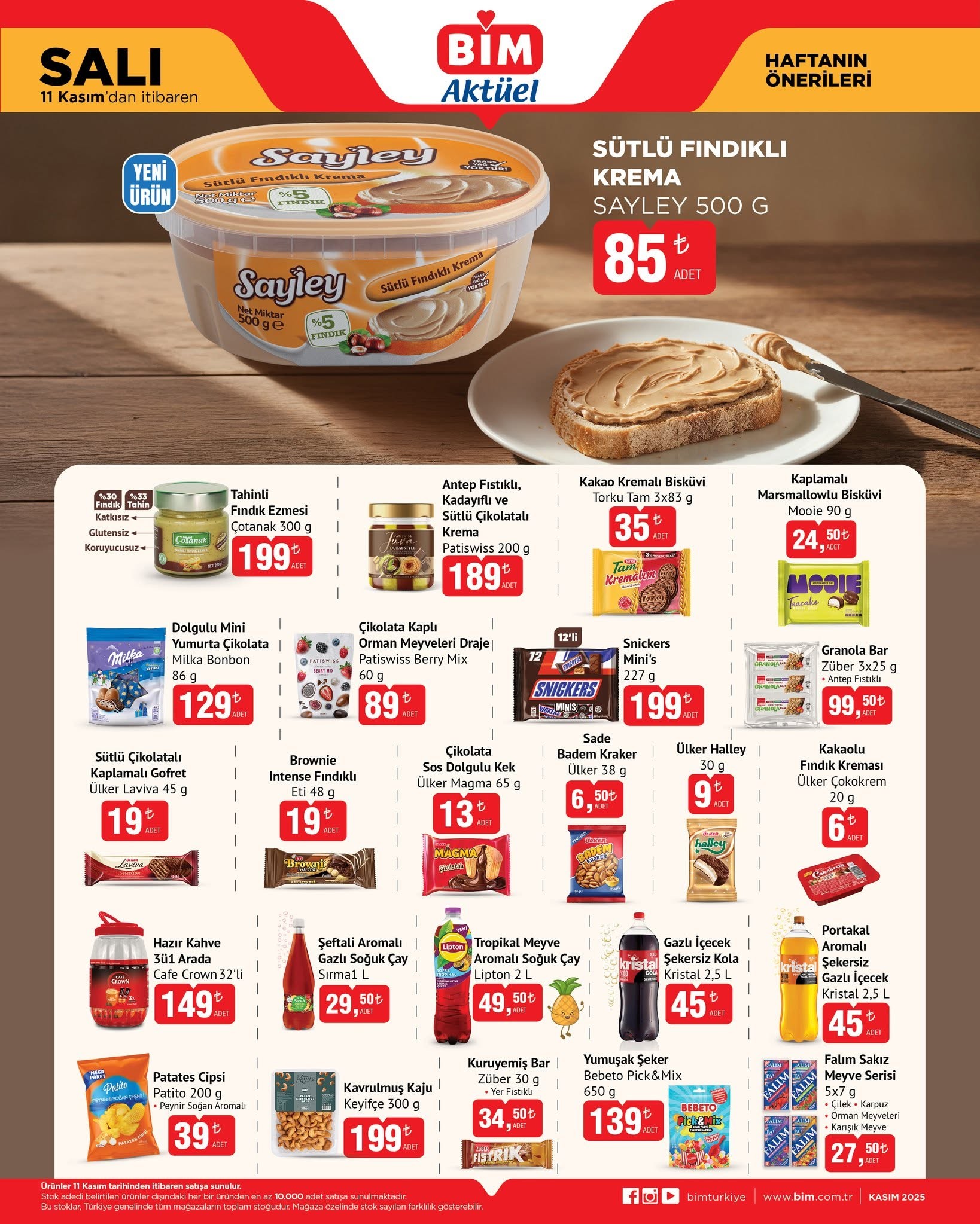 BİM Market, 11 Kasım Salı gününden itibaren geçerli olacak aktüel ürünlerini duyurdu. Çeşitli et ürünleri, süt ve süt ürünleri, tatlılar ve kahvaltılıklar raflarda yerini alacak. Stokların Türkiye geneli için geçerli olduğu belirtildi.
