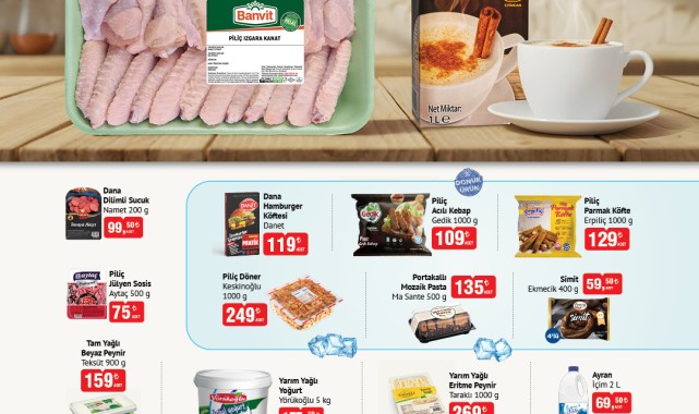 Kampanyalar kapsamında piliç ızgara kanat, salep, dilimli sucuk, dana hamburger köftesi, açılı kebap, parmak köfte, sosis, döner gibi et ürünlerinin yanı sıra portakallı mozaik pasta, simit, tam yağlı beyaz peynir, yarım yağlı yoğurt ve çeşitli ayran çeşitleri de tüketicilerin beğenisine sunulacak.