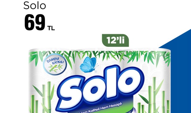 BİM marketleri, bambu katkılı ve suya ultra dayanıklı Solo marka 12'li tuvalet kağıdını 69 TL'den satışa sundu. Ürün, güçlendirilmiş doku teknolojisiyle dikkat çekiyor.