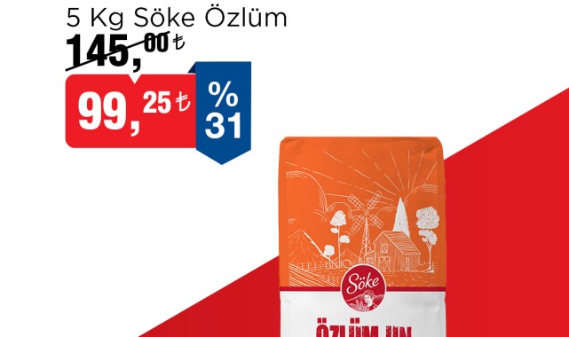Belirtilen tarihler arasında mağazalarda bulunacak olan Söke Özlem 5 kg un, normal fiyatı olan 145 TL yerine 99,25 TL'den satışa sunulacak. Bu indirimle birlikte üründe %31'lik bir fiyat avantajı sağlanmış olacak.