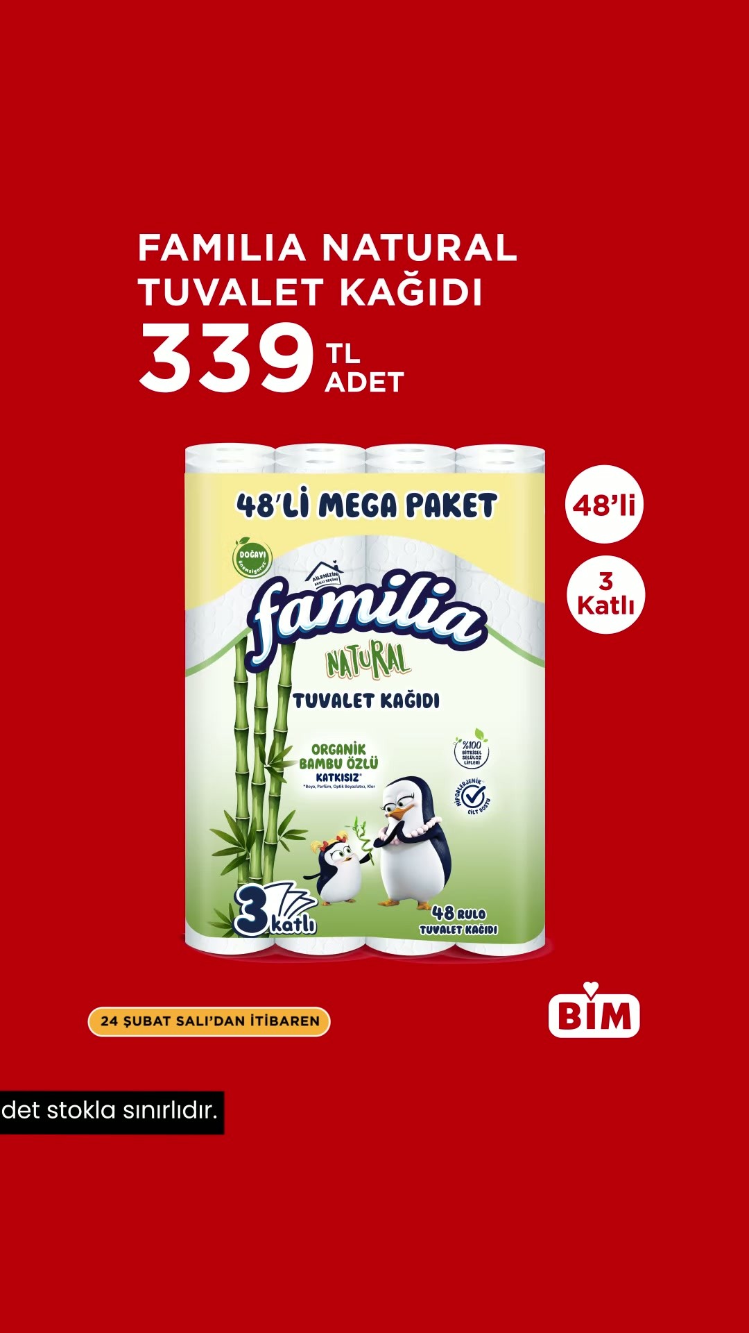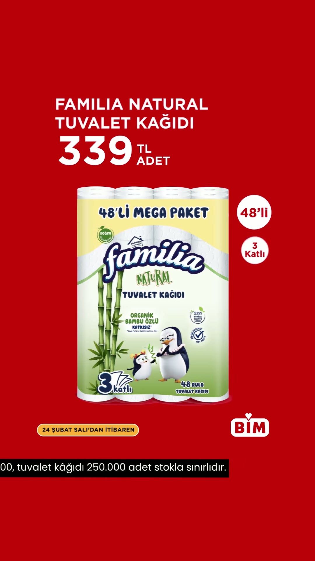 BİM, 24 Şubat Salı günü geçerli olacak aktüel ürünler kataloğunu duyurdu. Bu hafta raflarda yerini alacak ürünler arasında Familia Natural markalı kağıt havlu ve tuvalet kağıdı bulunuyor.Kampanya kapsamında Familia Natural Kağıt Havlu 199 TL'den, Familia Natural Tuvalet Kağıdı ise 339 TL'den satışa sunulacak. Stoklarda kağıt havlu için 250.000, tuvalet kağıdı için ise 250.000 adet ürün bulunacağı belirtildi.