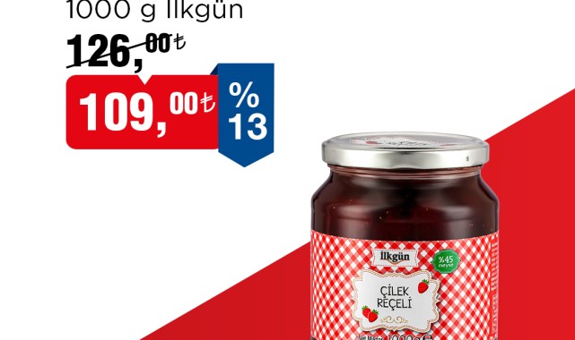 Örnek ürünler arasında 1000 gramlık Ilkgün marka Çilek Reçeli dikkat çekiyor. Bu ürünün eski fiyatı 126,00 TL iken, indirimli satış fiyatı 109,00 TL olarak belirlendi. Çilek Reçeli'nin %13 oranında indirime girdiği belirtildi. Ürünün %45 meyve içeriğine sahip olduğu da paylaşıldı.