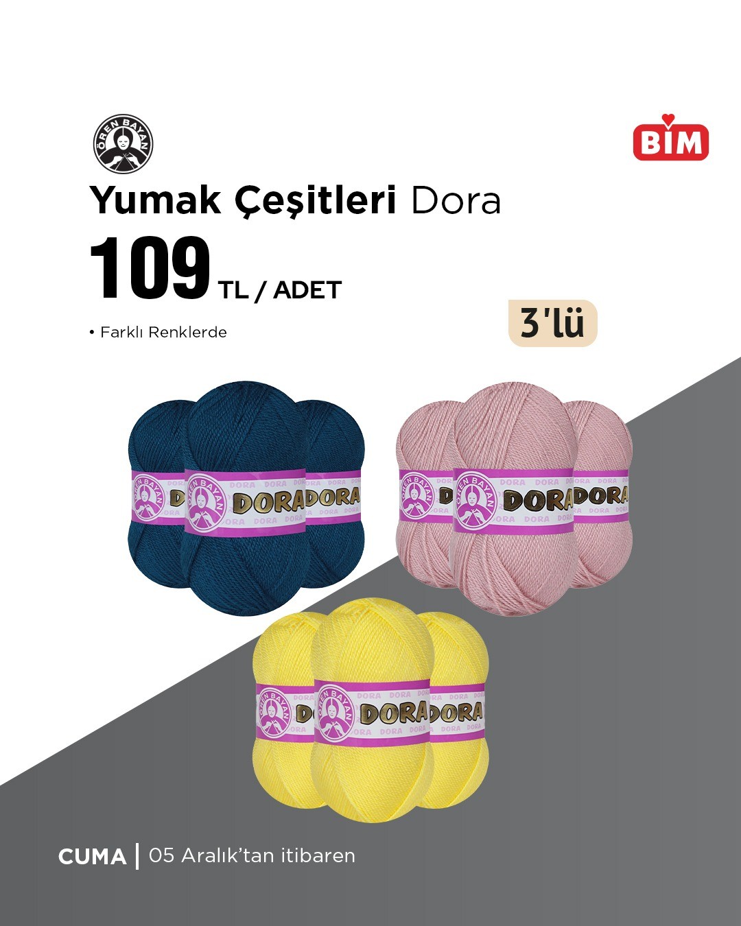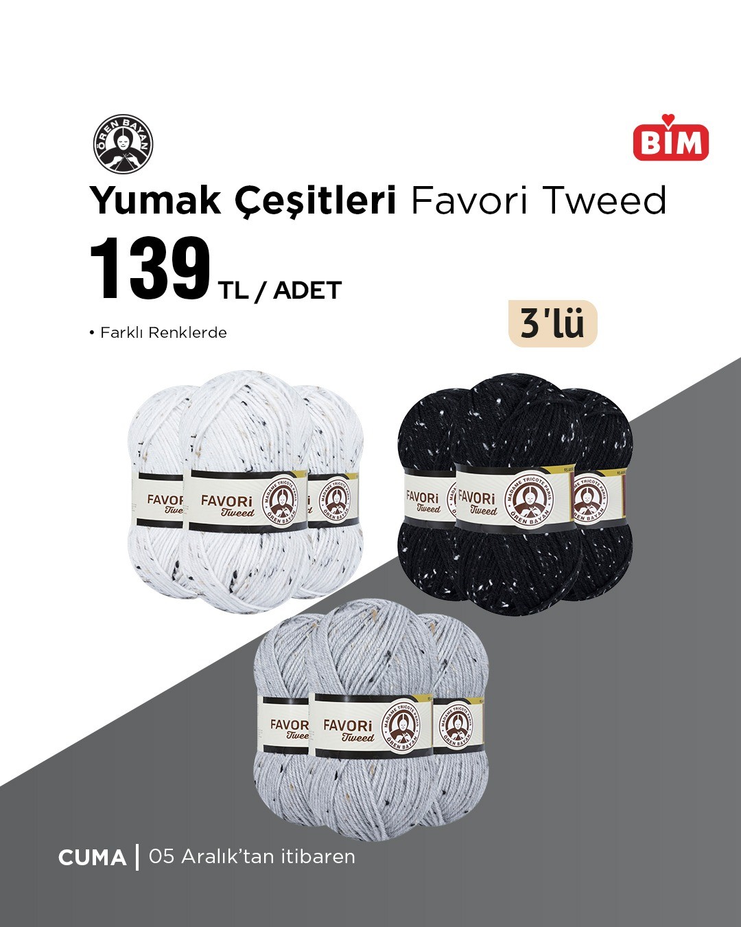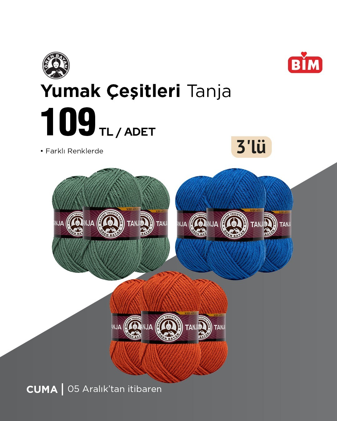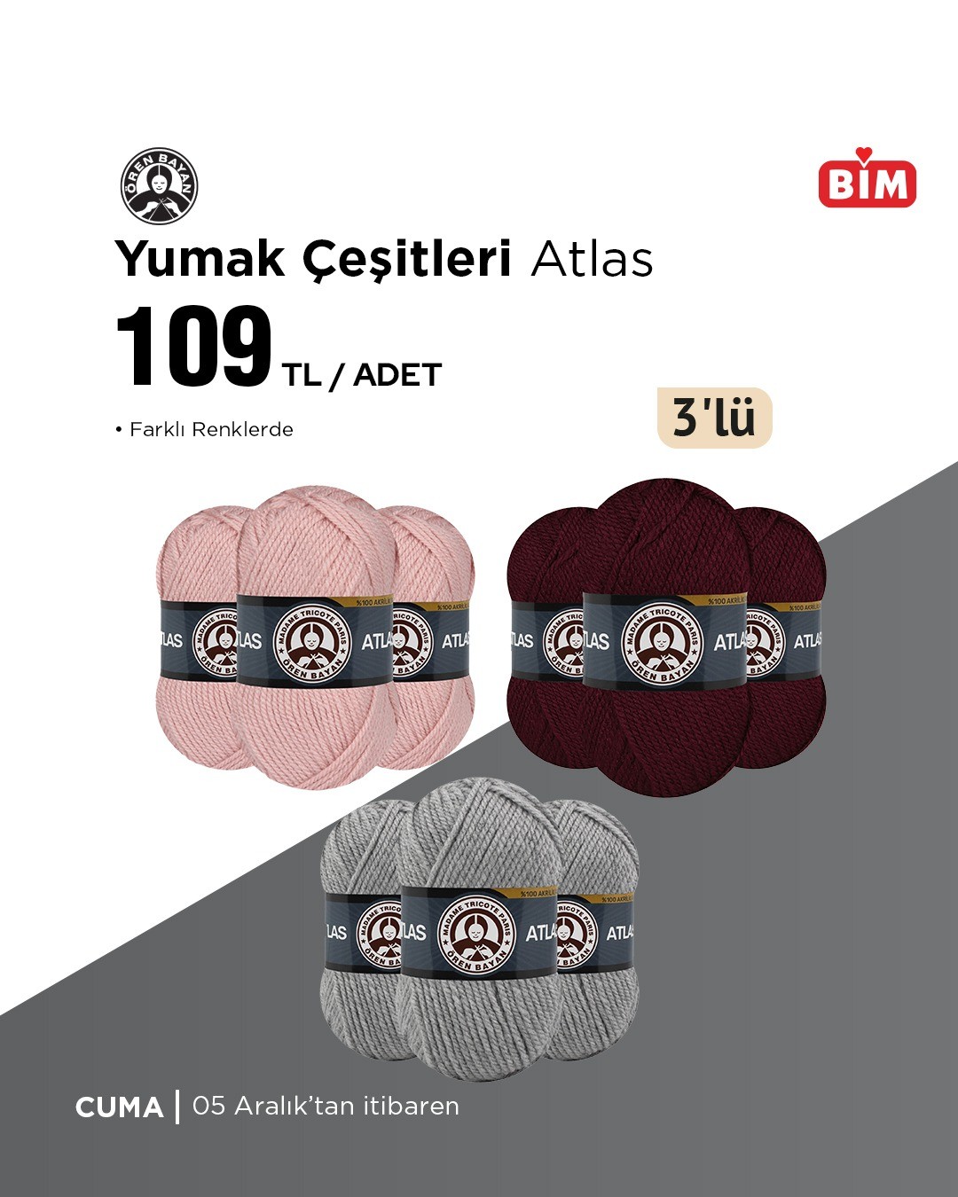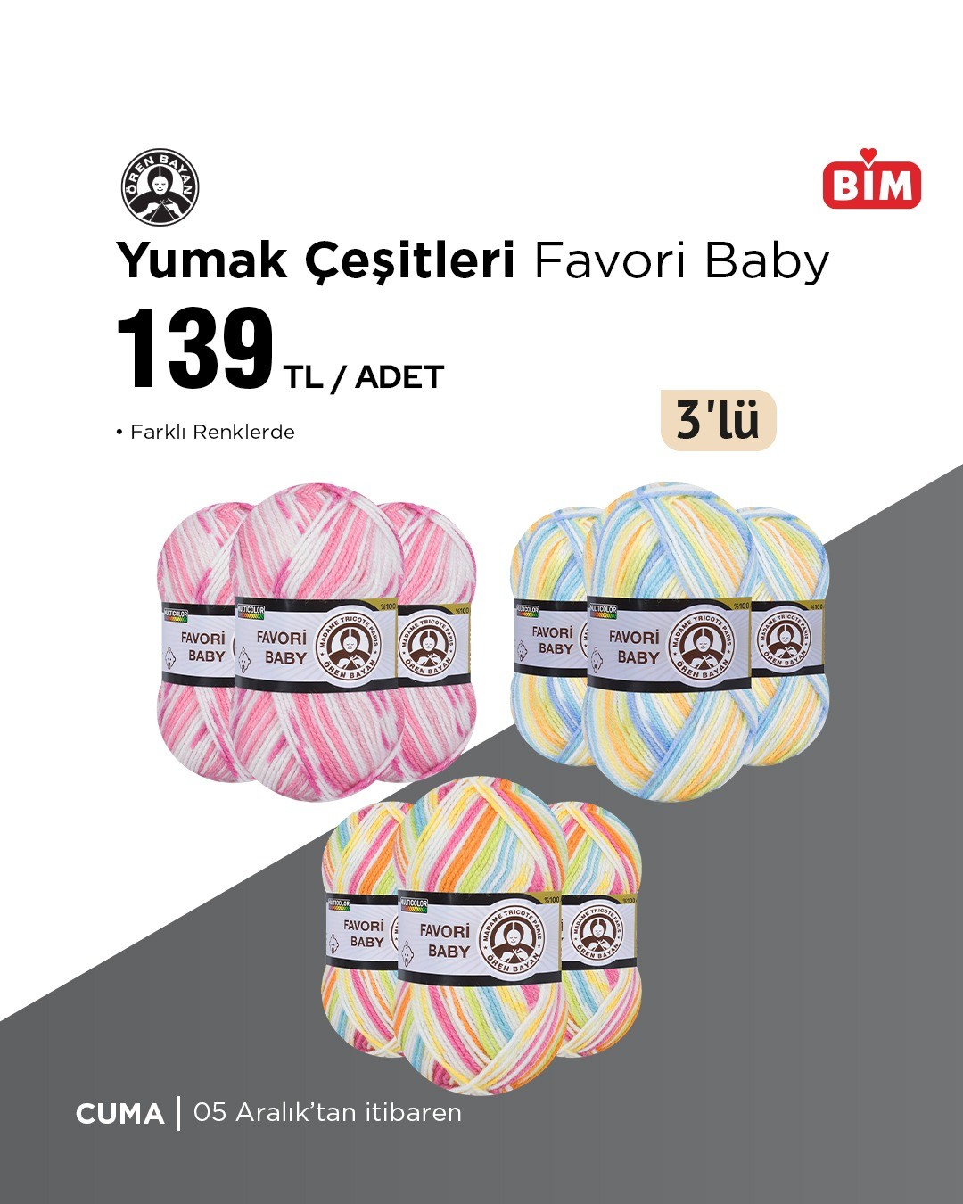 BİM, 5 Aralık Cuma gününden itibaren geçerli olacak yeni ürünlerini duyurdu. Kampanyada farklı renklerde yumak çeşitleri de yer alıyor. Detaylar bim.com.tr'de.