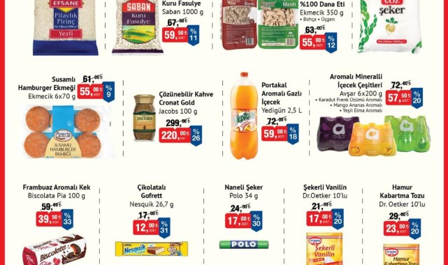 Kampanyada Efsane marka 2,5 kg'lık pilavlık pirinç 132,50 TL'ye, Saban marka 1000 g'lık kuru fasulye 59,50 TL'ye, Ekmecik marka 350 g'lık kıymalı mantı 55,00 TL'ye ve Safak marka 5 kg'lık toz şeker 189,00 TL'ye düşecek. Hamburger ekmeği, kahve, gazlı içecekler, kek, gofret, naneli şeker, vanilin ve kabartma tozu gibi ürünlerde de çeşitli oranlarda indirimler bulunuyor.Temizlik ve Kişisel Bakım Ürünleri de İndirimde