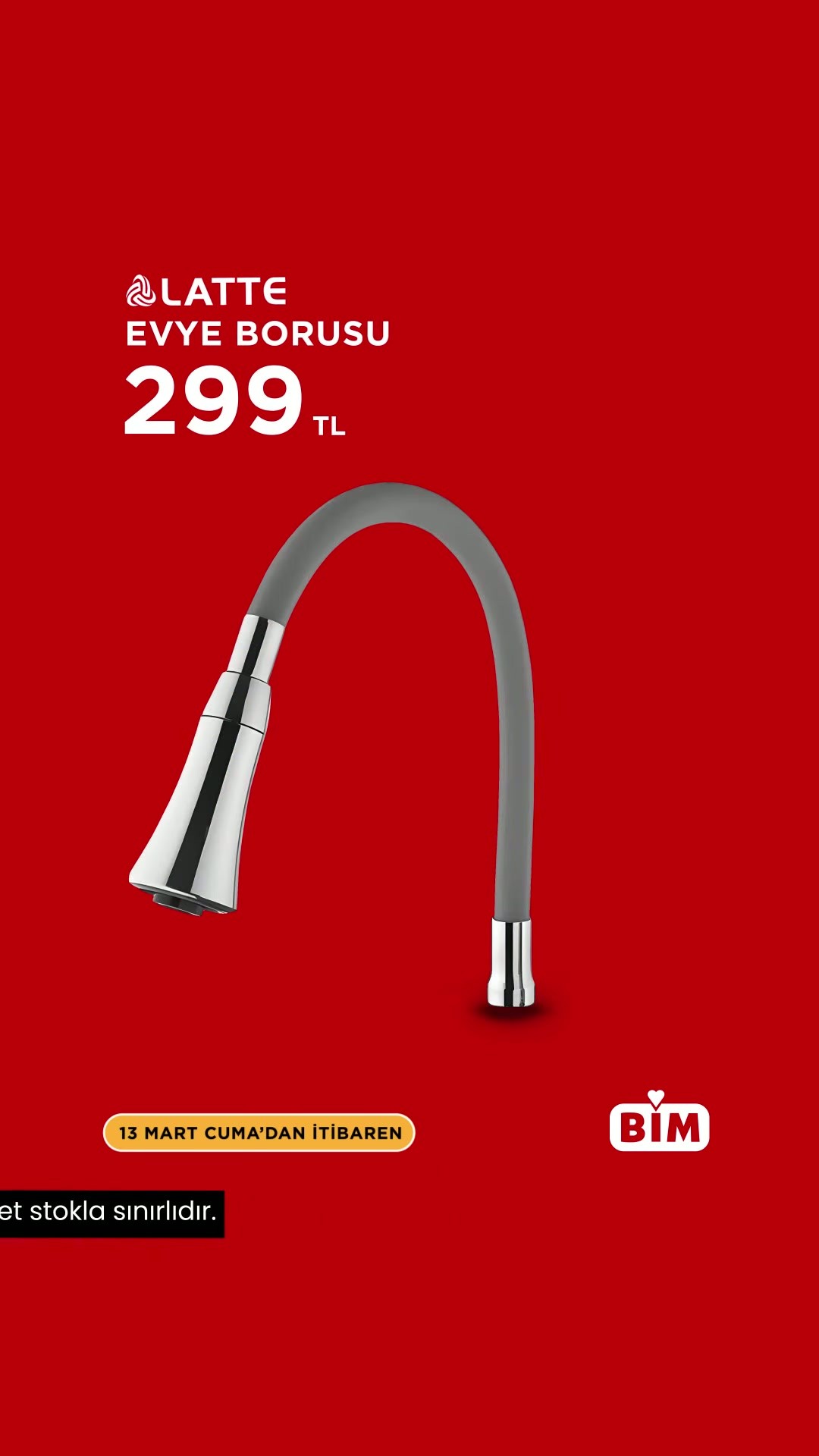 Aynı gün BİM raflarında yerini alacak bir diğer ürün ise evye borusu. 299 TL fiyat etiketiyle satışa sunulacak olan evye borusundan ise 53.352 adet stok bulunacak.Editör: Haber MerkeziKaynak: Sosyal Medya