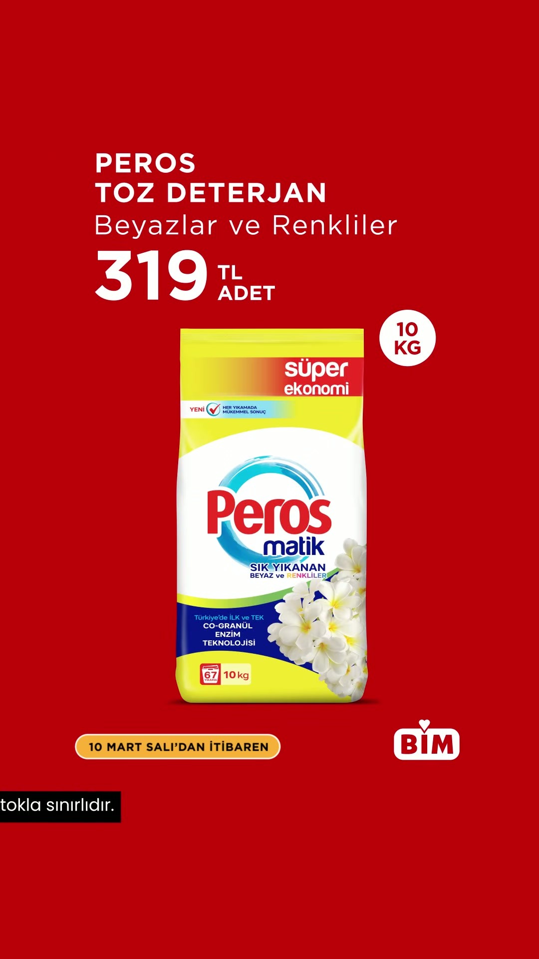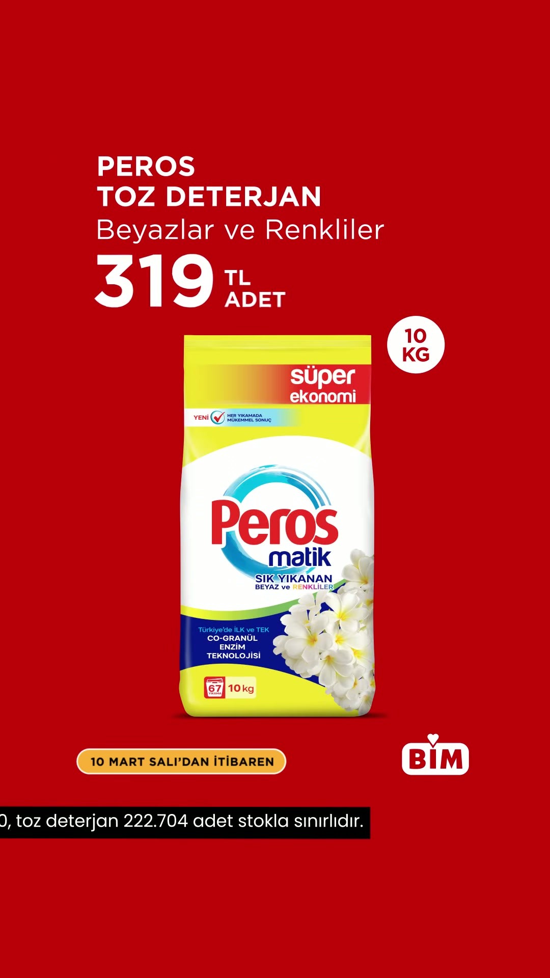 Aynı gün satışa sunulacak Peros Toz Deterjan'ın 319 TL'den satışa çıkacağı aktarıldı. Deterjan için stok adedinin 222.704 olduğu bilgisi paylaşıldı. BİM, bu ürünlerle birlikte Salı gününe özel bir alışveriş fırsatı sunmayı hedefliyor.Editör: Haber MerkeziKaynak: Sosyal Medya