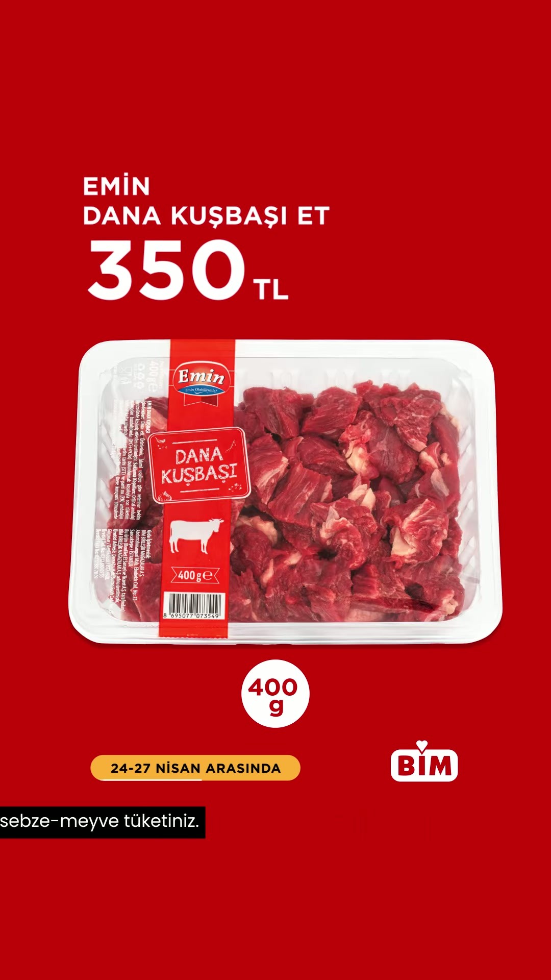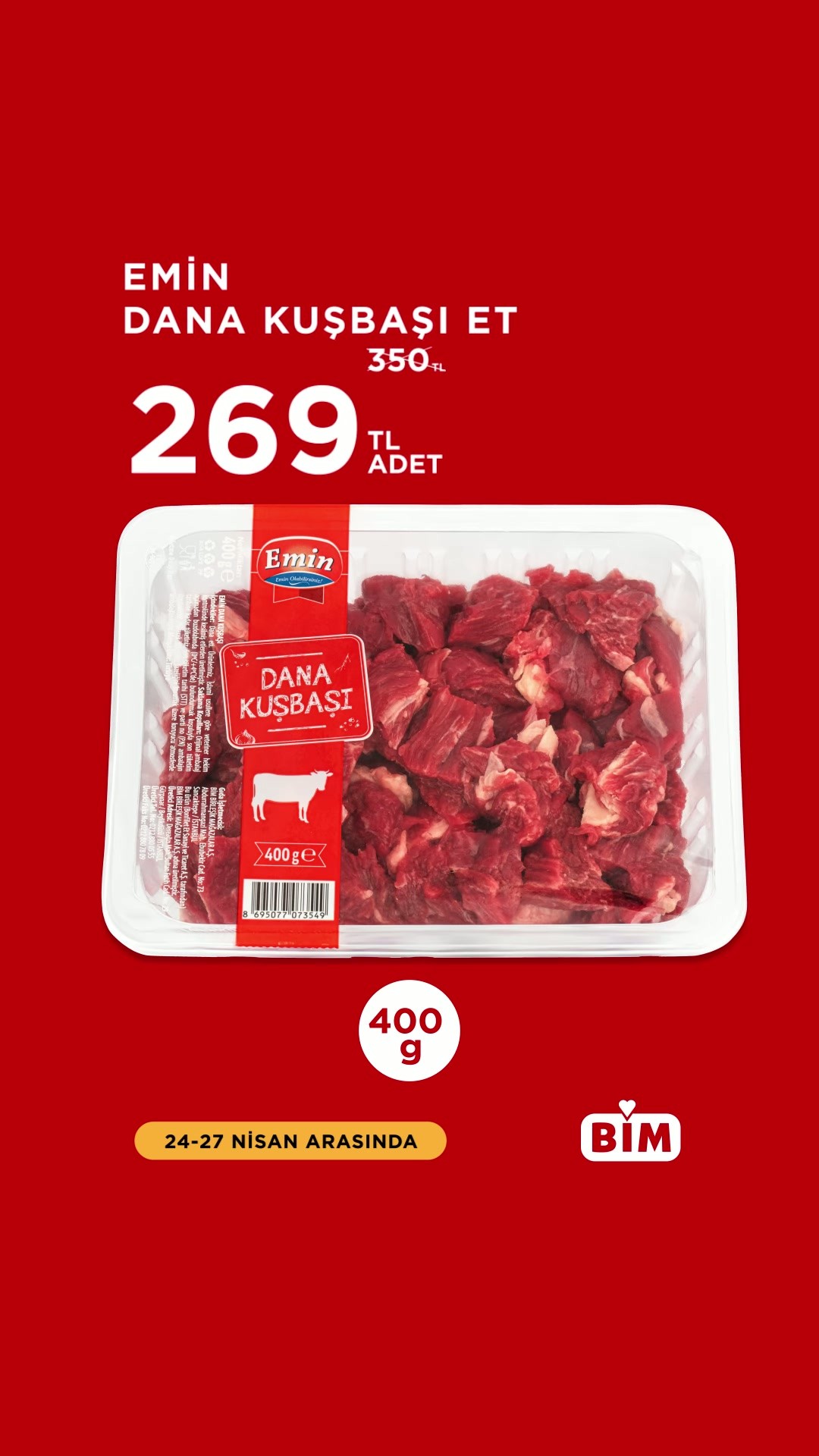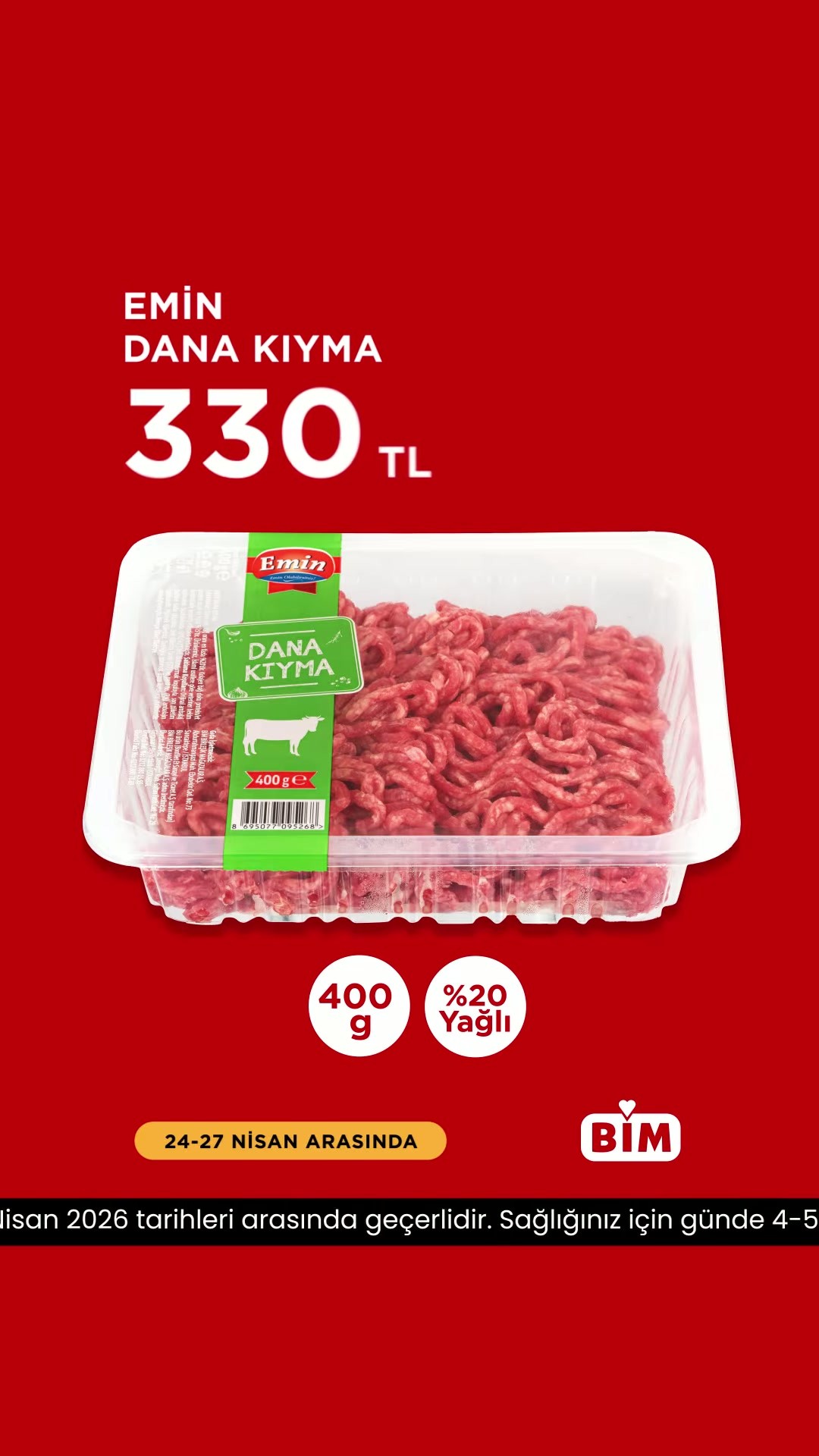 BİM, 24-27 Nisan tarihleri arasında geçerli olacak özel bir indirim kampanyasıyla müşterilerini mağazalarına davet ediyor. Kampanya kapsamında Emin marka dana kıyma, indirimli fiyatıyla raflarda yerini alacak.