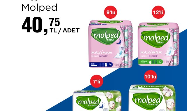 Kampanyada yer alan Molped ürünleri arasında gece ve normal kullanıma uygun pedler bulunuyor. Görselde yer alan bilgilere göre, Molped Ultra Maximum Kapasite & İncelik Gece 9'lu ve Normal 12'li paketleri ile Molped Pure & Soft Cilt Dostu Organik Pamuk Gece 7'li ve Normal 10'lu paketleri indirimli fiyatlarla satışa sunulacak. Bu ürünler, farklı ihtiyaçlara yönelik çözümler sunarak geniş bir kullanıcı kitlesine hitap ediyor.Kampanya Detayları ve Geçerlilik Tarihleri