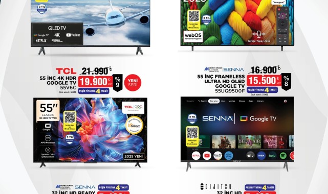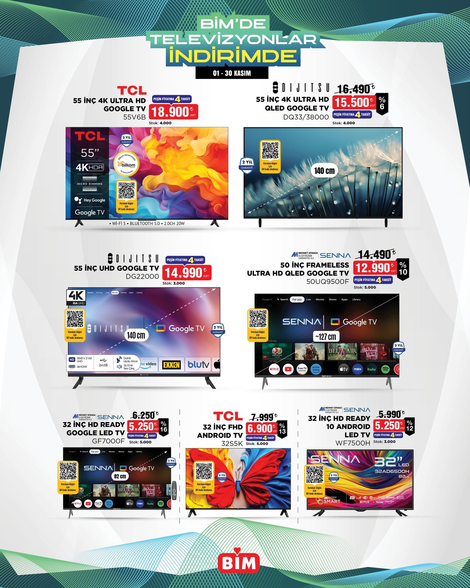 BİM, 01-30 Kasım tarihleri arasında geçerli olacak kampanyasıyla çeşitli markalardaki televizyon modellerinde önemli indirimler sunuyor. Kampanyada hem büyük ekranlı hem de daha kompakt TV'ler yer alıyor. Tüketiciler, peşin fiyatına 4 taksit imkanından da faydalanabilecek.