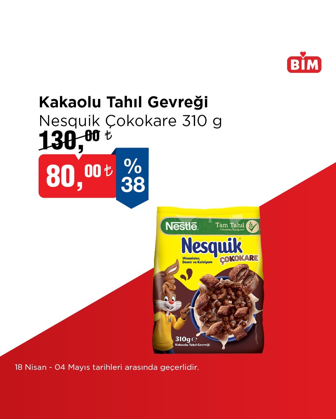 BİM'in Instagram'da paylaştığı görsele göre, indirimdeki ürün 1 kg'lık Nesquik Kakolu Tahıl Gevreği. Ürün, vitaminler, demir ve kalsiyum içeriğiyle öne çıkıyor. Kampanyanın 18 Nisan - 04 Mayıs tarihleri arasında geçerli olacağı belirtilirken, markaların mağazalara göre farklılık gösterebileceği de ek bilgi olarak paylaşıldı.Editör: Haber MerkeziKaynak: Sosyal Medya