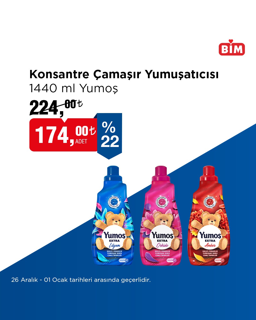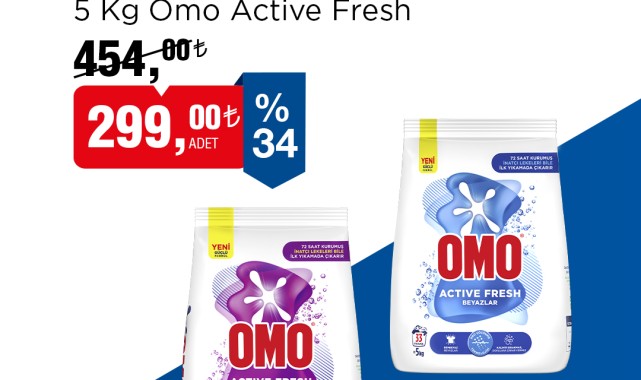 Perakende devi BİM, 26 Aralık ile 01 Ocak tarihleri arasında geçerli olacak yeni indirimli ürünlerini duyurdu. Kampanyalı ürünler arasında, özellikle temizlik kategorisinde dikkat çeken fırsatlar yer alıyor.Kampanya kapsamında, BİM mağazalarında 5 Kg'lık Omo Active Fresh Toz Deterjan çeşitleri indirime giriyor. Hem Beyazlar hem de Renkliler için sunulan Omo Active Fresh Toz Deterjan, %34'lük indirimle raflardaki yerini alacak.İndirimli fiyatlarla sunulan Omo Active Fresh Toz Deterjanlar BİM müşterilerine 299,00 TL fiyat etiketiyle sunuluyor. İndirimli fiyatlar, 26 Aralık tarihinden itibaren başlayıp 01 Ocak tarihine kadar geçerli olacak.BİM tarafından yapılan açıklamada, müşterilerin daha fazla ürün ve çeşit için bim.com.tr adresini ziyaret edebileceği belirtildi.Editör: Haber MerkeziKaynak: Sosyal Medya