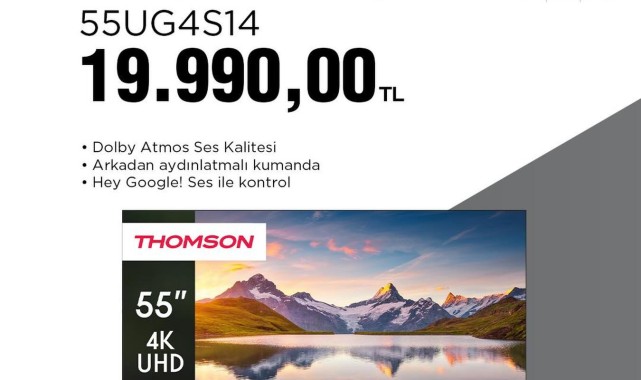 Kampanyada yer alacak olan 55UG4S14 model numaralı Thomson marka televizyon, 4K UHD çözünürlüğe sahip. Dolby Atmos ses kalitesi, arkadan aydınlatmalı kumanda ve Google Asistan ile sesli kontrol gibi özellikler sunan ürün, 19.990,00 TL fiyat etiketiyle satışa sunulacak. Televizyonda Netflix, Prime Video, Disney+, YouTube ve Spotify gibi popüler uygulamalar için de yerleşik destek bulunuyor. Ürün, 2 yıl garanti ile birlikte geliyor ve stok adedi 2000 olarak belirtildi.