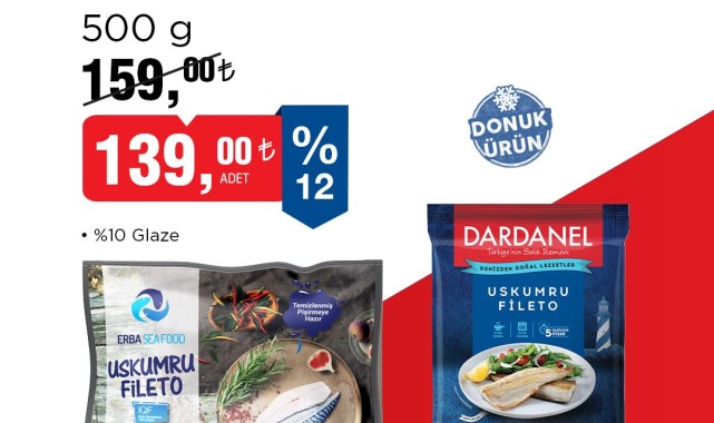 BİM, 6-9 Mart tarihleri arasında Dardanel markalı Uskumru Fileto ürününü mağazalarında satışa sunuyor. Ürün, dondurulmuş ve temizlenmiş olarak tüketicilere ulaşıyor.