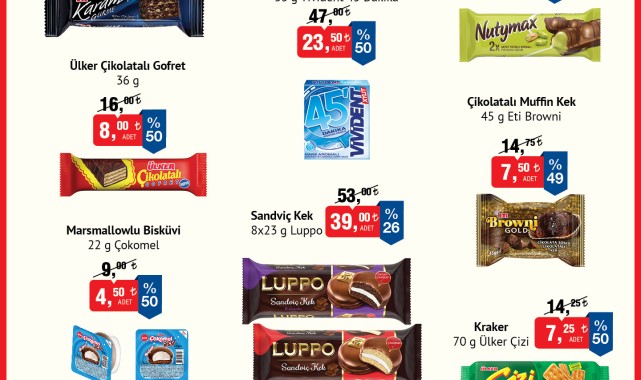 Kampanya detaylarına göre, Karam Gurme 50 g Eti 25,00€ yerine 15,00€'dan, Ülker Çikolatalı Gofret 36 g 16,00€ yerine 8,00€'dan satışa sunulacak. Marshmallowlu Bisküvi 22 g Çokomel %50 indirimle 4,50€'ya, Nane Aromalı Sakız 33 g Vividient ise 23,50€'ya düşecek. Antcp Fıstıklı Gofret 44 g Nutymax 20,00€, Çikolatalı Muffin Kek 45 g Eti Browni 7,50€ ve Sandviç Kek 8x23 g Luppo 39,00€'dan satışa sunulacak. Ülker Çizi Kraker 70 g ise 7,25€'ya indirilecek. Parti boy Haribo Altın Ayıcık 130 g 27,50€, Haribo Starmix 130 g de aynı fiyatla tüketicilerin beğenisine sunulacak.Editör: Haber MerkeziKaynak: Sosyal Medya