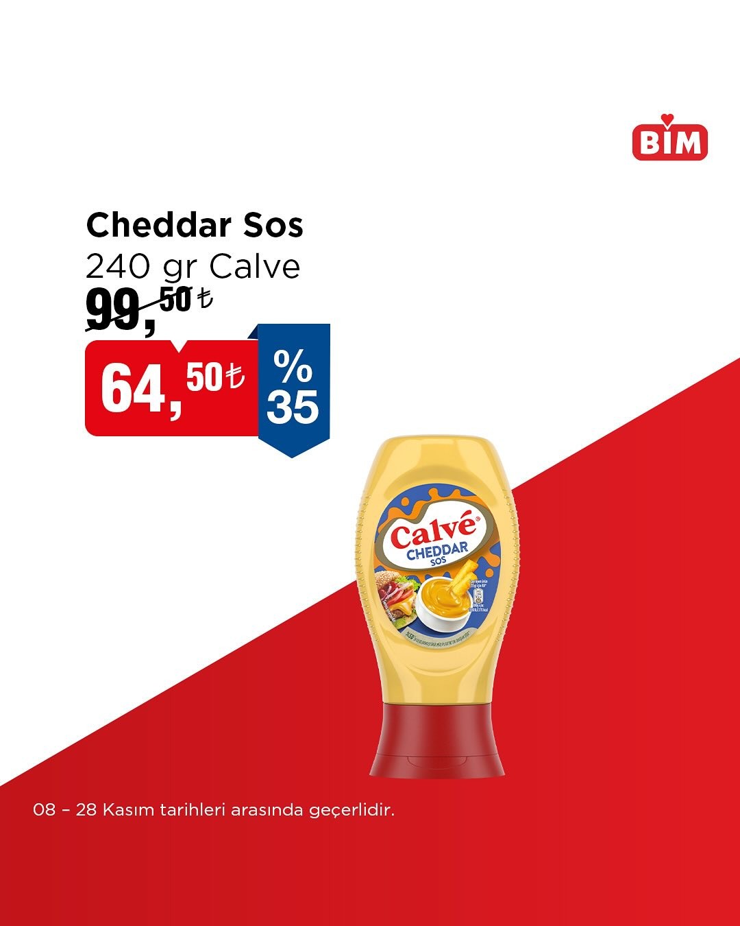 Ulusal market zinciri BİM, 08-28 Kasım tarihleri arasında geçerli olacak seçili ürünlerdeki indirimlerini duyurdu. Mağazalarda yer alacak ürünler ve detaylar hakkında bilgi veren BİM, daha fazla çeşit için bim.com.tr adresini ziyaret edilebileceğini belirtti.Calve Ranch Sos Kampanyası Dikkat Çekti