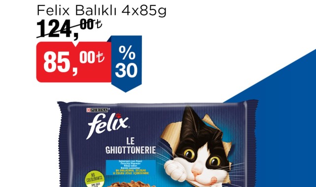 Kampanya detaylarına göre, Felix Balıklı 4x85g yaş mama çeşitleri, 21 Nisan ile 04 Mayıs tarihleri arasında geçerli olacak şekilde %30 indirimle sunulacak. Normalde 124,00 TL olan ürünler, indirimle birlikte 85,00 TL'den satışa sunulacak.