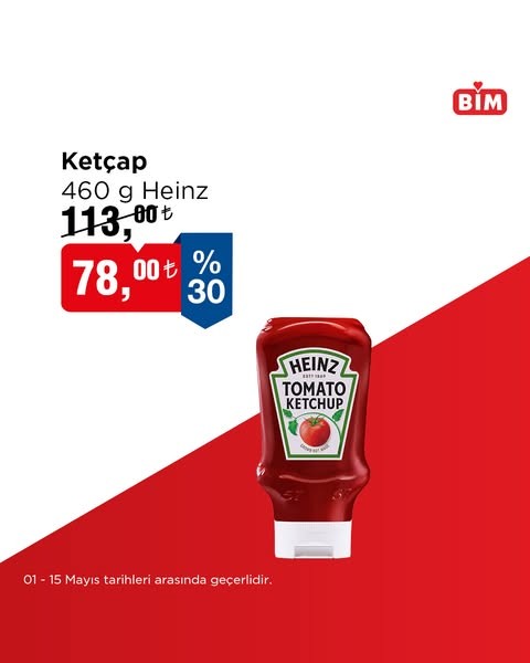 BİM, 1-15 Mayıs tarihleri arasında geçerli olacak indirimli ürünlerini duyurdu. Kampanya kapsamında, özellikle Heinz marka mayonez dikkat çekiyor.