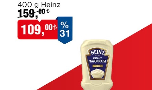 BİM, 1-15 Mayıs tarihleri arasında geçerli olacak indirim kampanyasını duyurdu. Kampanya kapsamında Heinz marka 400 gramlık mayonez %31 indirimle 109 TL'den satışa sunulacak.