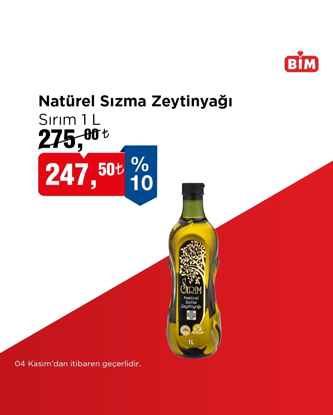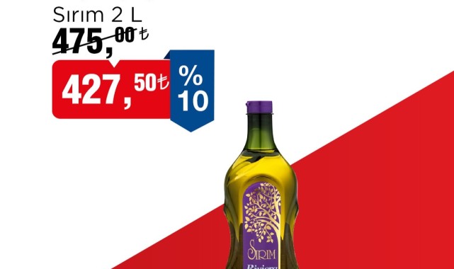 BİM marketleri, 4 Kasım'dan itibaren geçerli olacak kampanyasında 2 litrelik Sırım Riviera Zeytinyağı'nda yüzde 10 indirim sunuyor. Ürün, 475 TL'den 427,50 TL'ye düşen fiyatıyla dikkat çekiyor.