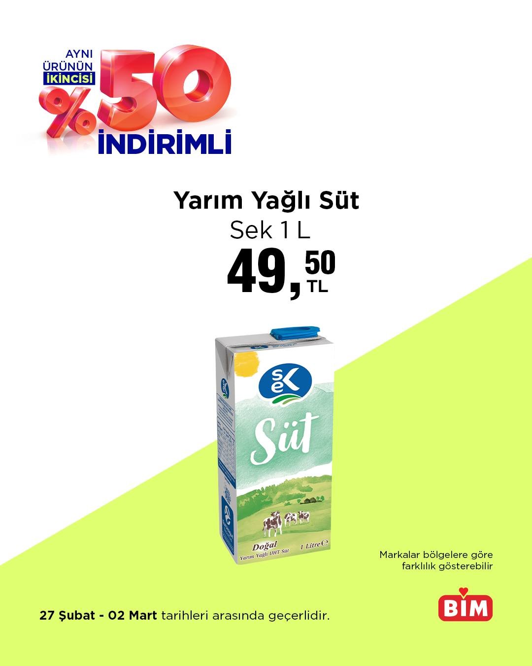 BİM marketleri, 27 Şubat - 02 Mart tarihleri arasında geçerli olacak yeni indirim kampanyasını duyurdu. Kampanya kapsamında, seçili ürünlerde özel fiyatlar ve indirimler tüketicilerin beğenisine sunulacak.Özellikle yarım yağlı süt ürünlerinde dikkat çekici bir kampanya yer alıyor. Görselde yer alan bilgilere göre, bir adet yarım yağlı sütün tam fiyatına iki adet süt alınabilecek. Bu kampanya, süt ve süt ürünleri tüketenler için önemli bir ekonomik fırsat sunuyor.