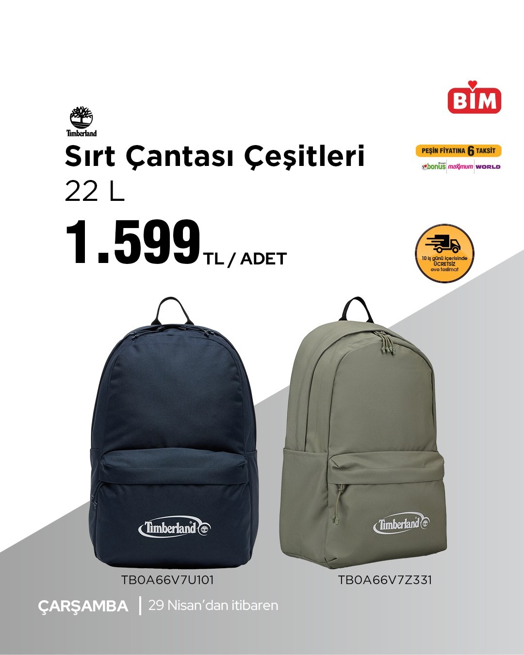BİM, 29 Nisan'dan itibaren geçerli olacak kampanyasıyla Timberland marka 27 litrelik sırt çantalarını 1.799 TL'den satışa sunuyor. Ürünlerde peşin fiyatına 6 taksit ve 10 iş günü içinde ücretsiz iade imkanı bulunuyor.
