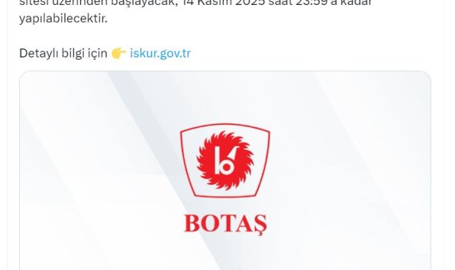 ENERJİ ve Tabii Kaynaklar Bakanlığı, Boru Hatları ile Petrol Taşıma Anonim Şirketi (BOTAŞ) bünyesinde istihdam edilmek üzere 223 yeni personel alımı gerçekleştirileceğini duyurdu.Bakanlığın sosyal medya hesabından yapılan açıklamada, "BOTAŞ bünyesinde istihdam edilmek üzere 223 yeni personel alımı gerçekleştirilecektir. Başvurular, 10 Kasım 2025 tarihinde Türkiye İş Kurumu (İŞKUR) internet sitesi üzerinden başlayacak, 14 Kasım 2025 saat 23.59'a kadar yapılabilecektir" denildi.